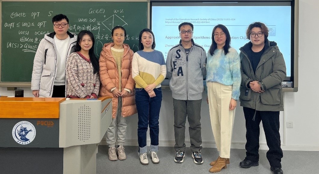 研讨会开始,邓露教授先介绍了创新团队目前的研究进展。接着,就相关研究内容,刁卓副教授介绍了最优化领域中的k-Correlation Clustering问题,该问题属于NP-hard问题。随后分享了最新研究成果“Approximation Algorithms on k-Correlation Clustering”。该研究为k-Correlation Clustering问题提出了一种多项式时间内的近似解,其近似比能达到max{a, [(2−k)a+k−1]/k}。经过探讨,大家认为该算法能够广泛应用于金融网络、风险管理、欺诈检测等领域中的聚类问题,为复杂金融数据的空间结构特征研究提供思路。