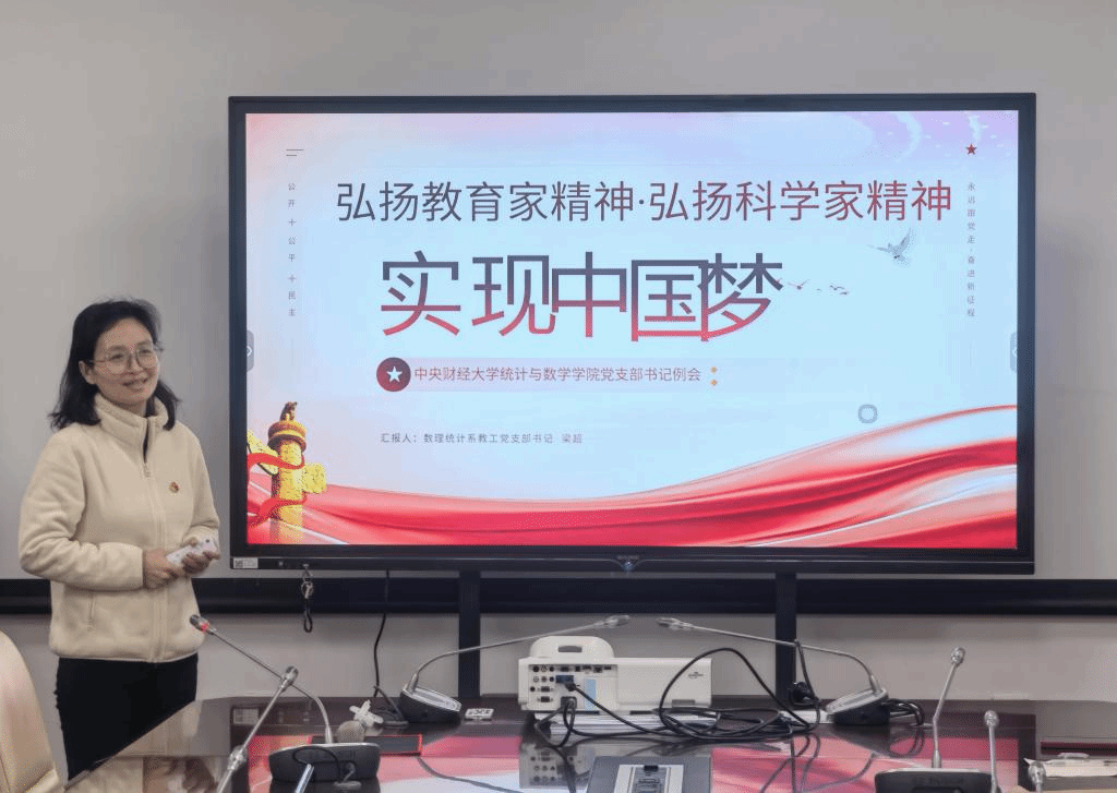 会议开始,数理经济系教工党支部书记梁超以“弘扬教育家精神,弘扬科学家精神——实现中国梦”为题作专题讲座,先后阐释了教育家精神内涵以及科学家精神内涵,以廖山涛、张筑生等为榜样进行分享,最后对如何传承和弘扬相关精神品质进行阐释。