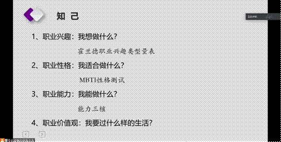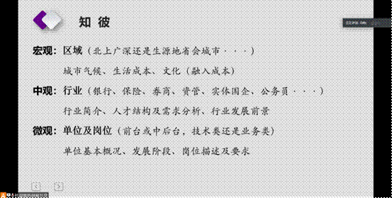 冯帅老师从求职者的自我认知到工作对象的认知,从简历制作投递到笔试、面试,系统全面地剖析了老员工求职的全过程,为大家勾勒了一个动态求职的全貌。冯帅老师指出,求职的全过程可以主要分为两个准备与三个环节。他说:“两个准备”包括“知己”与“知彼”两个维度,“知己”是向内的,对自我职业兴趣、性格、能力及价值观的探索,“知彼”是向外的,是对工作区域、行业、单位及岗位的认知。而“知己”和“知彼”的认知探索是一个动态的过程,需要贯穿整个求职过程。