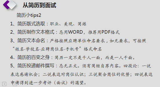 按照“考官四问“完成简历撰写后,冯帅老师又带领大家重新从HR筛选简历视角审视简历审美及内容逻辑,并从简历版式选取、文本格式、文本命名、简历个性化、以及投递注意事项等几个方面做了详细的补充说明。