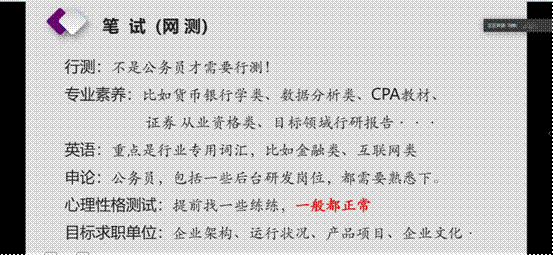 在充分做到“两个准备”后,求职就进入到了“三个环节”:简历制作与投递”、“笔试”和“面试”。他首先强调了笔试需要从专业素养、行测、申论、英语、心理测试以及求职目标单位及岗位等六个方面进行全方位准备。随后,重点对简历的制作及投递做了系统详细的分解。
