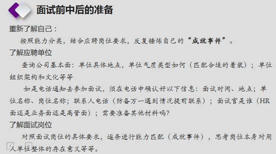 最后的面试指导中,冯帅老师在讲解了面试的分类、礼仪后,着重从面试前中后三个环节做了分析。他尤其强调,建议同学们运用“TREEEE(大树)原则”或“STAR原则“,撰写自身的”成就事件“,为简历的撰写和面试的应答做好素材积累。