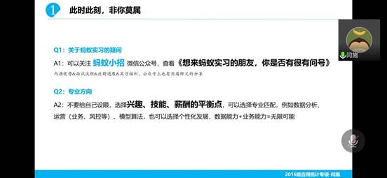 闫施,2016级应用统计专业硕士研究生,现就职于蚂蚁金服风险策略岗。“数据能力+业务能力=无限可能”,“不要给自己设限,选择兴趣、技能、薪酬的平衡点”,闫施员工建议大家在岗位选择上要多多尝试,趁着年轻及时试错,总会找到适合自己的岗位。针对互联网行业的实习,学长推荐了“蚂蚁小招”公众号,公众号上会有很多学长学姐在互联网行业实习的经验贴。他还补充,在互联网公司同事之间比较亲近,没有太多距离感,管理较为扁平化,工作环境比较轻松,身边的同事大多都有满满的社会责任感,积极参与公益事业,真的是“和一群有情有义的人,一起做有价值有意义的事!”。最后,他指出互联网公司的工作压力相对较大,每个人都要制定自己的目标,压力会推动你完成目标,这个过程有些艰辛,但最后的结果会很令人开心。