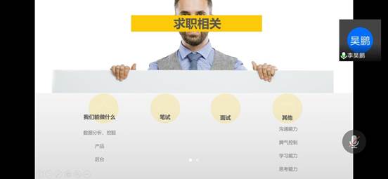 第四场互联网行业专题讲座邀请到了李昊鹏、闫施两位员工和今年的应届毕业生徐孝杰为大家分享。