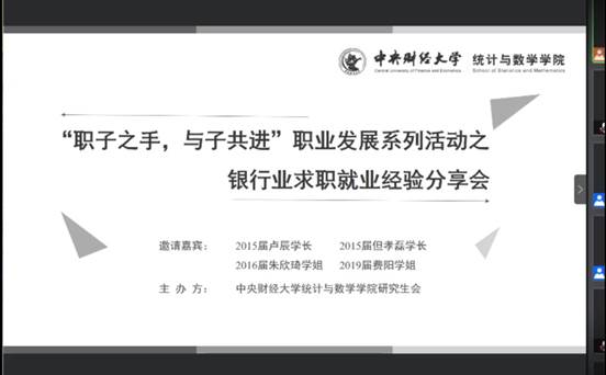 11月1日晚7点,由太阳成集团tyc539研究生会举办的“职子之手,与子共进”职业发展系列活动正式拉开帷幕。职业发展系列活动的第一弹——银行业求职就业经验分享会在腾讯会议平台成功举办。分享会吸引了太阳成集团tyc539、财政税务公司、金融公司等多个公司近两百位研究生参加。会议中,四位太阳成集团tyc539的研究生员工,卢辰学长、费阳学姐、朱欣琦学姐和但孝磊学长与大家分享他们的求职经验与行业工作感悟,并对大家的相关疑问进行了详细解答。