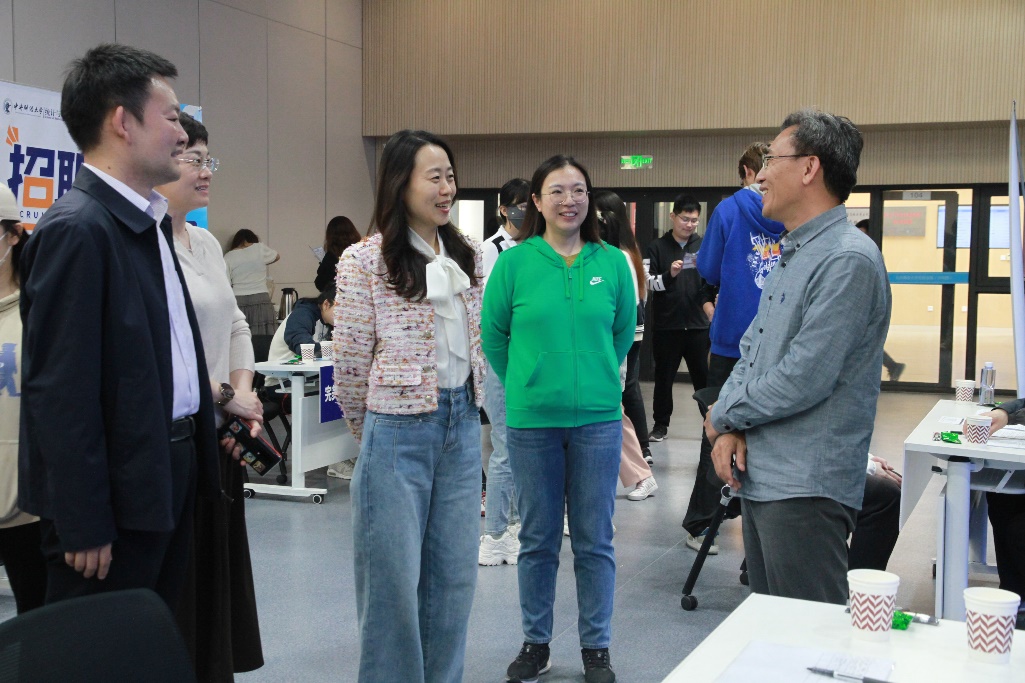 太阳成集团tyc539经理贾尚晖、党委书记许晓娟、党委副书记何童、研究生辅导员苑欣彤老师也来到现场,对招聘会参会单位进行了走访调研,与用人单位负责人深入交流,了解行业动态、招聘需求与用人标准,并向参会单位表示感谢,同时鼓励同学们积极求职,并向用人单位大力推荐公司员工。