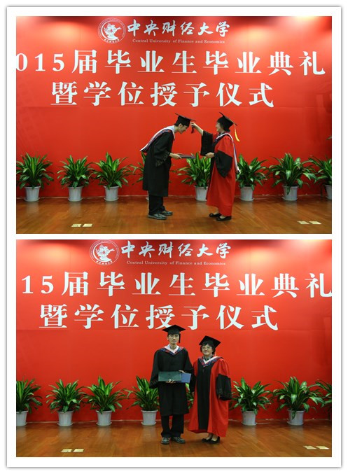在《我的未来不是梦》、《光阴的故事》等充满期盼、鼓舞的乐曲声中,激动人心的学位授予仪式正式开始。副经理王秀国老师、毛炳寰老师分别宣读了2015届本科、硕士毕业生学位授予名单,毕业生们怀着喜悦与激动的心情登台受礼,经理刘扬老师为毕业生一一拨转流苏,颁发毕业证书和学位证书,并与同学们热情握手,亲切合影。