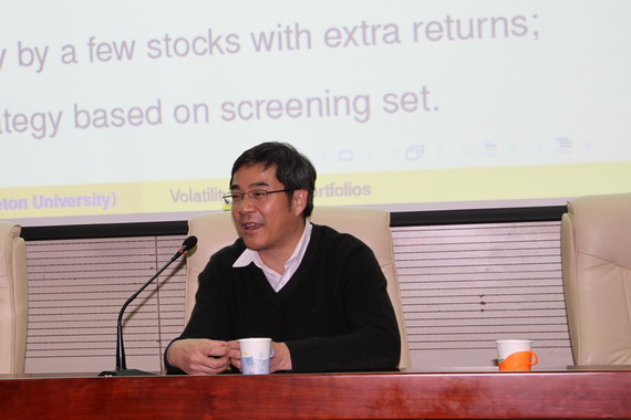 李俊生副董事长首先致辞,对范剑青教授的来访表示欢迎,对范剑青教授对的公司统计和数学学科发展的支持和关爱表示感谢。接下来刘扬教授介绍了范剑青教授的主要学术成就,随后范剑青教授开始做学术报告。范剑青教授首先从简单的回归模型出发,以浅显易懂的语言介绍了金融定价模型、多因子定价模型、以及市场有效性检验的传统统计方法。接下来范剑青教授系统地介绍了他在该领域的最新研究成果。他的研究表明股票市场的非有效性往往是由少数几只股票造成的,而不是像传统理论普遍认为的那样,即市场的非有效性是由大量的错误定价的股票造成的,并且传统市场有效性检验方法在高维数据中并不适用。范剑青教授提出了加强型因子定价模型检验方法,并利用该方法而创建投资组合。他指出该组合优于基于标准普耳500指数的投资组合。随后范剑青教授还与师生们就该方法的适用范围、前提假设、可拓展性问题等进行了深入的讨论。范剑青教授、张正军教授还回答了同学们关于人生规划、学业选择等方面的提问。
