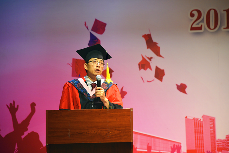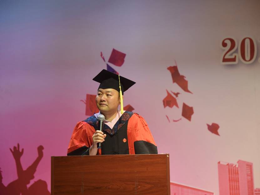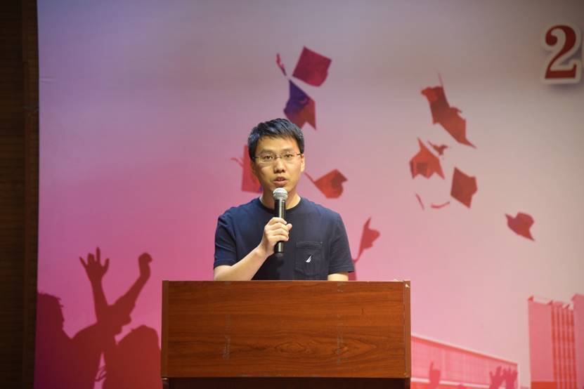 薛玉山老师作为教师代表向毕业生们表达了最诚挚的祝贺,他对全体毕业生提出了三点希望,一是保持敬畏反思,二是找准定位方向,三是牢记责任担当。薛老师的讲话巧妙引用了许多数学专有名词,引发了毕业生的阵阵共鸣。