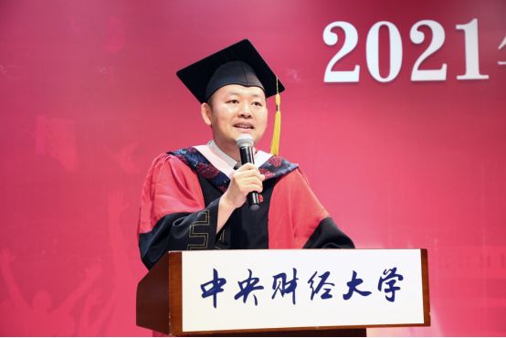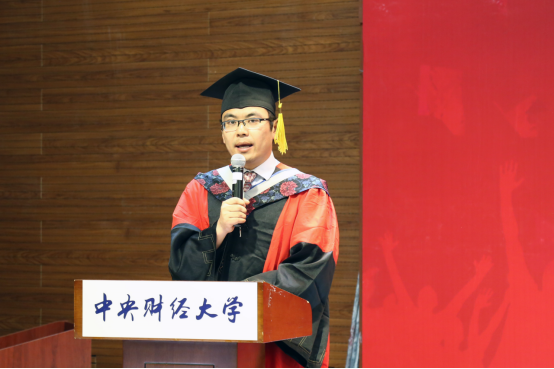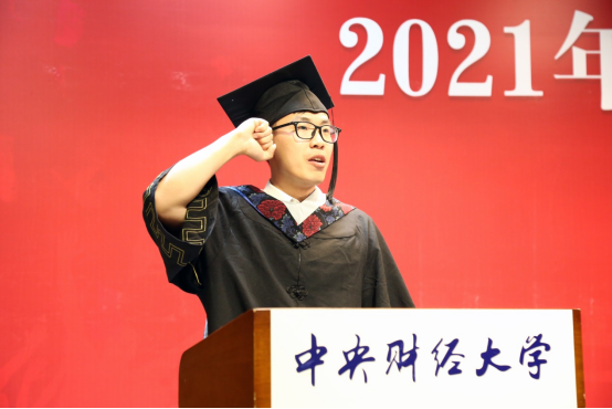 2018级应用统计专业硕士崔基瑞作为2020届毕业生代表发言,他表达了能够弥补去年未能返校遗憾的欣喜和对公司、公司的感谢与敬意,同时从自身经历谈起,号召大家一定谨记“忠诚、团结、求实、创新”的中财大校训,切实担负起新时代青年人的重任,不辜负母校对大家的培养。