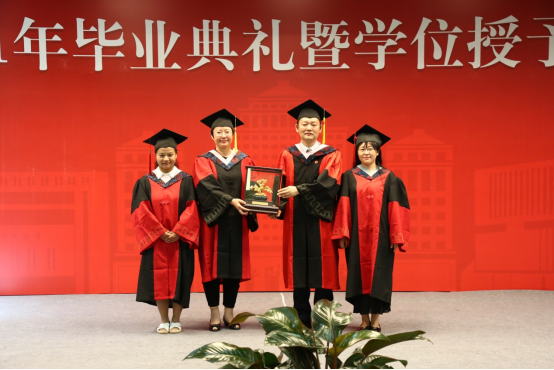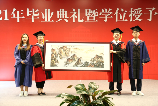 2021届博士毕业生丁琳同学主持毕业生感恩母校环节,2021届博士班、学硕班和专硕班毕业生精心准备了礼物,分别向公司表达感恩之情,感谢公司和老师们春风化雨般的教育,祝公司年年桃李,岁岁芬芳,乘风破浪,再谱华章!祝统数学子永远朝气蓬勃,愿公司如旭日东升,辉煌灿烂!祝公司春意盎然,硕果累累!经理贾尚晖和党委书记李全敏老师代表公司接收了毕业生们暖暖的心意。
