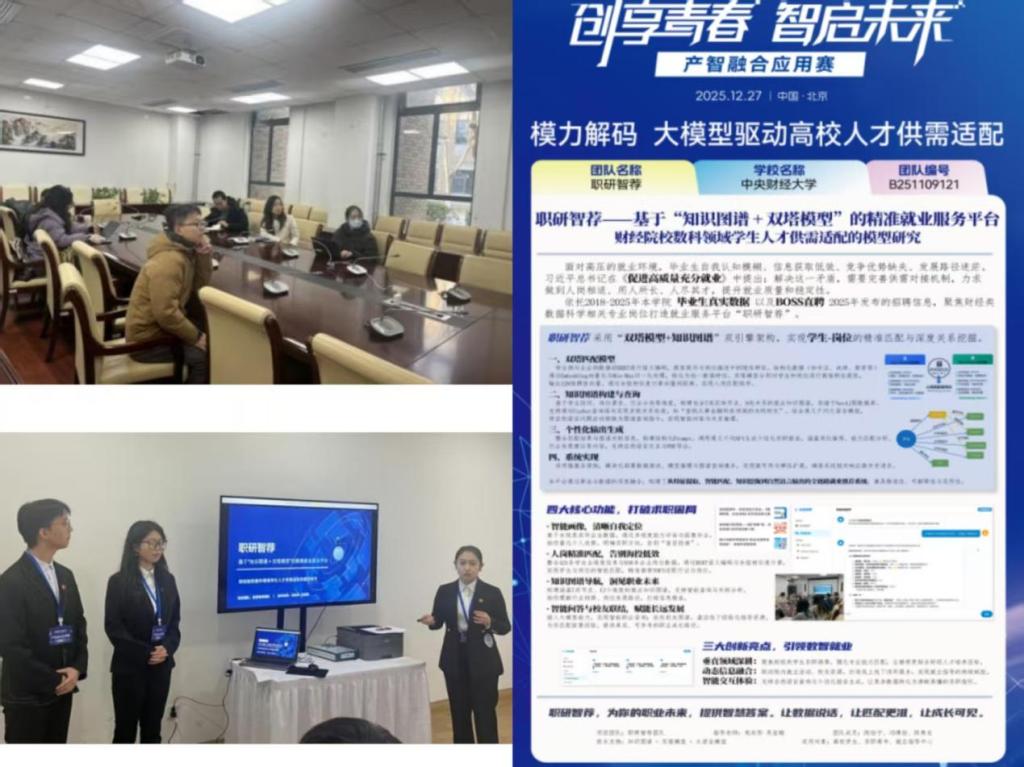 在“产智融合应用赛道”的“模力解码”赛题中,公司参赛团队聚焦高校人才供需适配问题,结合财经院校数据科学领域员工的实际求职痛点,聚焦职业规划与岗位精准匹配,开发了“职研智荐”智能就业服务系统。该系统依托员工个人信息与招聘网站的企业职位描述数据,综合运用机器学习、大模型调用等技术手段,创新融合双塔模型与知识图谱,打造覆盖职业推荐、职途问答、员工导师对接、职位详解等四大功能的智能服务全景,切实搭建起校企供需对接的桥梁,助力员工突破求职迷茫期,实现精准就业。