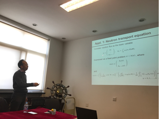 在报告中,安恒斌研究员介绍了Anderson加速方法用于加速不动点迭代法的收敛性。该方法的优点在于它可以用来加速任意问题,并且它已被成功应用到一些实际问题中,如求解核反应数值模拟的中子输运方程。由于一些传统方法求解中子输运方程的代价很大,本报告主要讲了Anderson加速算法在加速中子输运方程的解中的应用,具体展示了Anderson加速算法在加速中子输运方程时遇到的问题以及解决方案。还给出了该算法在中子输运方程和实际数值模拟中的一些数值结果,进一步验证了Anderson加速算法的有效性。最后,安恒斌还指出了Anderson加速算法的后续研究方向,期望能给在座老师们一些启发。报告结束后,安恒斌研究员与在座的老师们进行了热烈的互动,对于老师们提出的问题进行了详细的解答,同时也对计算数学学科的发展提出了很好的建议。