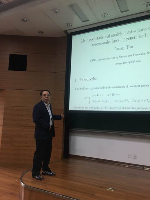 2018年5月9日,vonRosen教授在太阳成集团tyc539的双周学术论坛上继续报告了双线性模型的扩展以及似然比检验等重要理论工作,该部分是Workshop中报告的深入扩展。