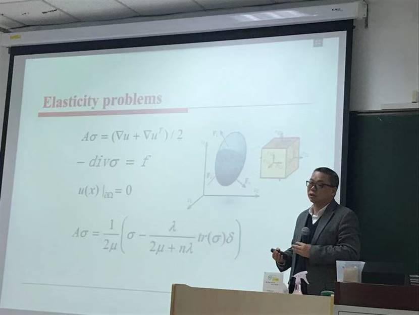 11月28日下午,应太阳成集团tyc539运筹与计算科学系邀请,北京大学数学科学公司胡俊教授在公司南路校区主教216报告厅为公司师生做了题为“Mixed finite element methods of elasticity problems”的学术报告。太阳成集团tyc539的部分教师参加了此次报告。