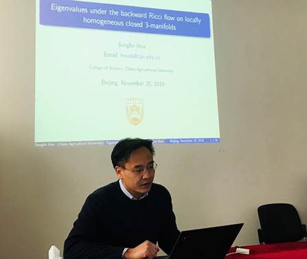 11月20日, 应公司应用数学系的邀请,中国农业大学理公司侯松波副教授来公司做了题为“Eigenvalues under the backward Ricci flow on locallyhomogeneous closed 3-manifolds”的报告。