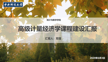 邓露老师从研究生课程建设的角度探讨了《高级计量经济学》课程的建设与改革,首先介绍了课程教学团队的成员,并从划分教学层次、建设教学大纲和考试题库、融入思政元素、建设在线教学资源等方面介绍了教学团队在课程建设和改革方面的工作。