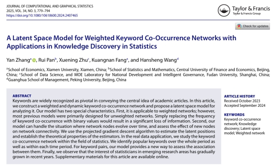 公司潘蕊教授与合作者上海对外经贸大学的张妍讲师、复旦大学的朱雪宁副教授、厦门大学的方匡南教授、北京大学的王汉生教授在高水平统计期刊Journal of Computational and Graphical Statistics上发表了题为《A latent space model for weighted keyword co-occurrence networks with applications in knowledge discovery in statistics》的论文。