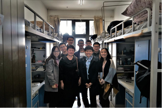 董事长助理朱凌云老师首先来到的是8号楼210宿舍,朱老师欣喜地与大家谈论起老员工活。有同学提到这是第一次完全独立的打理自己的生活,因此时常出现种种混乱和不适。面对生活中不期而至的慌乱,朱老师提醒同学们相互交流,相互协作,提高学习生活效率。唯有照顾好身体,安顿好生活,才有精力提升内在。走访时间恰在中午,朱老师从午饭质量和食堂就餐状况问起,又以亲切幽默的表达消除了同学们与领导近距离接触的紧张情绪,小小的宿舍其乐融融,欢声笑语之间尽是脉脉温情。