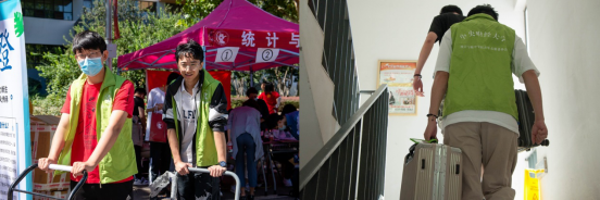 志愿者们按照预先的分工,分别在校门指引岗、报到流程岗、宣传拍摄岗、行李搬运岗等岗位上尽心尽力,让新生们的入校第一印象如回家一般。