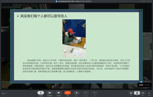 汇报人陈哲昂则从“青年应该有使命感”出发,认为青年首先要清楚青年应该“想什么、做什么”,要把命运与国家联系在一起。紧接着,他通过“90后”以及身边学长的抗疫事迹阐述了青年应该勇于担当,在大难临头之时敢于献身,成为一个有为青年,实现自己的社会价值。