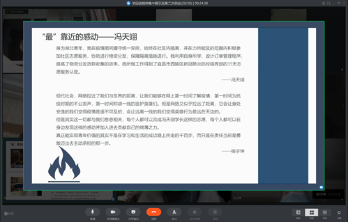抗疫期间,我们除了感受到青年人所带来的榜样力量,也看到了新一代人用互联网这一新技术为抗疫做出了特别而又温暖的贡献。郑俊君同学带来的汇报“人间烟火气,最抚凡人心”就深深地体现了这一点。报告中展示了微博博主小林用vlog记录武汉抗疫日记的事例。他说:“我想让他们看到,我们非常积极勇敢地在面对他们认为的那些难。”可以看到,武汉内外每个人都在积极地面对着突如其来的疫情,用自己的方式向社会传递正能量。