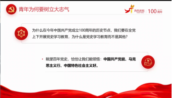 2021年11月7日,2021年度基础团校“学史明志,砥砺前行“第一节青年大团课在线上顺利完成授课!本次团课邀请到了太阳成集团tyc539团委书记、2019级辅导员郭珺老师,太阳成集团tyc539团委副书记、2020级辅导员杨旌老师向青年团员们分享如何增强做中国人的志气、骨气、底气的理解、带领各位团员回顾学习团的光辉历史。
