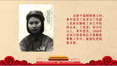 “党的好女儿、青年团员丁佑君,自愿离开城市,到边远农村参加社会改革工作。她在开展征粮工作时,被暴乱的国民党残匪逮捕。面对匪徒,丁佑君不怕酷刑,不惧羞辱,坚贞不屈,为了新中国的巩固和广大农民的翻身解放献出了年仅19岁的生命。她是这个时期优秀青年团员的突出代表。”