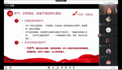郭老师以一段《觉醒年代》的视频向大家展示了何为有志气、骨气、底气的中国人。何为志气?志气便是志存高远,投身于党的伟大事业。这需要广大中国青年树立远大理想,投身党的事业,将个人前途与党的宗旨和国家命运同频共振,与时代一起前行,与人民共同奋斗。如何树立志气?