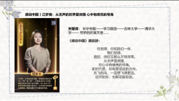 第二团小组选择以PPT讲述的方式,为大家呈现“赤心贯苍穹”中国航天人、“无声玉满堂”江梦南的故事。穷且益坚,不坠青云之志,青年一代有理想,有担当,国家就有前途,民族就有希望,从青年榜样的身上,学习用理想信念塑造起青年一代挺拔的灵魂;
