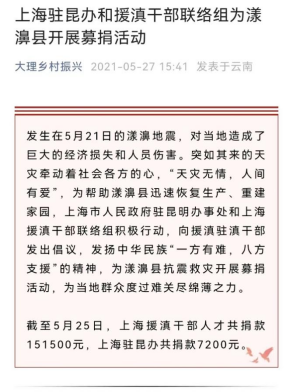 2021年,上海对口帮扶大理州计划内财政资金34239万元,实施项目59个,已全面完成并发挥效益。2022年上海对口帮扶大理州计划内财政资金37334万元,实施项目60个,目前项目全面启动实施,到7月20日,完成投资17819.16万元,投资完成率47.73%。项目建设完成情况在全省一直走在前列。