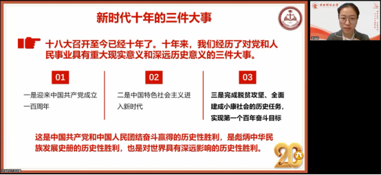 李晓婷讲师围绕“扎根脱贫,聚焦青年”为主题展开了宣讲。讲师先是总结了新时代十年内全党全国的三件大事,一是中国共产党成立百年,二是中国特色社会主义进入新时代,三是历史性地完成脱贫攻坚、全面建成小康社会实现第一个百年目标。