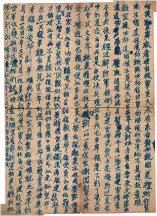 ”吃水别忘了挖井人,吃食别忘了毛主席的恩,我们应永远跟着共产党走,积极生产,搞副业,努力支援朝鲜战争,争取当模范军属。弟在前方多杀敌人,把美帝鬼子消灭在朝鲜,保卫家和祖国……“