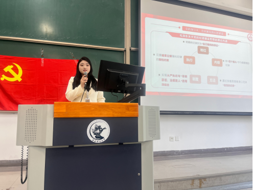 研究生宣讲团执行团长皮福玲进行题为:以史为鉴,以案促学——从“实”出发,在党纪学习教育中解锁“青春密码”的专题宣讲。她通过梳理党的领导人关于纪律建设的相关论述引出学习《条例》的重要性,引导党员从警示案例中深入学习和理解条例;提出“青春不能任性,纪律不能挑战”,学纪、知纪、明纪、守纪是每一位党员应有的自觉行动,呼吁同学们从自身做起。