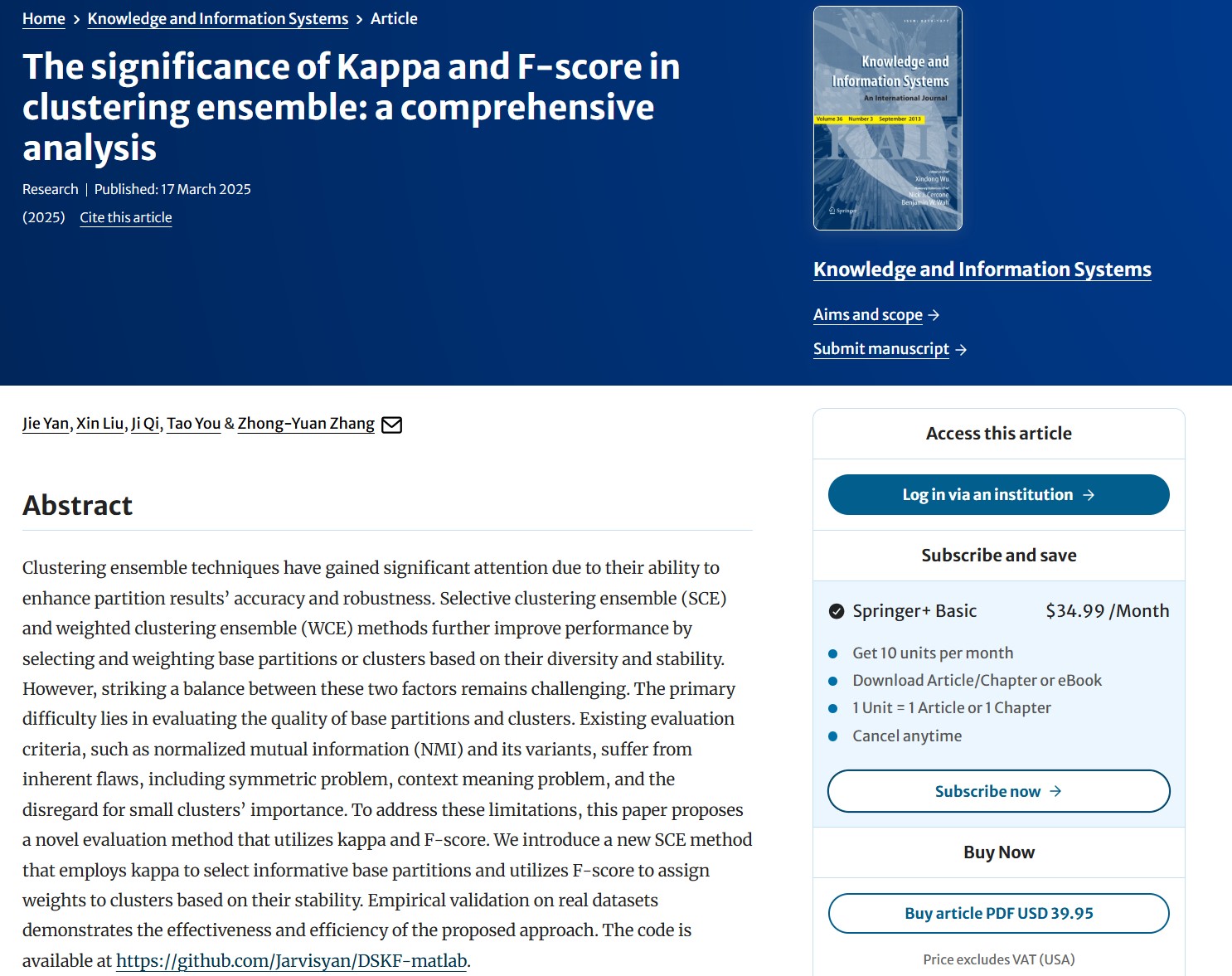 论文摘要:Clustering ensemble techniques have gained significant attention due to their ability to enhance partition results’ accuracy and robustness. Selective clustering ensemble (SCE) and weighted clustering ensemble (WCE) methods further improve performance by selecting and weighting base partitions or clusters based on their diversity and stability. However, striking a balance between these two factors remains challenging. The primary difficulty lies in evaluating the quality of base partitions and clusters. Existing evaluation criteria, such as normalized mutual information (NMI) and its variants, suffer from inherent flaws, including symmetric problem, context meaning problem, and the disregard for small clusters’ importance. To address these limitations, this paper proposes a novel evaluation method that utilizes kappa and F-score. We introduce a new SCE method that employs kappa to select informative base partitions and utilizes F-score to assign weights to clusters based on their stability. Empirical validation on real datasets demonstrates the effectiveness and efficiency of the proposed approach. The code is available at https://github.com/Jarvisyan/DSKF-matlab.