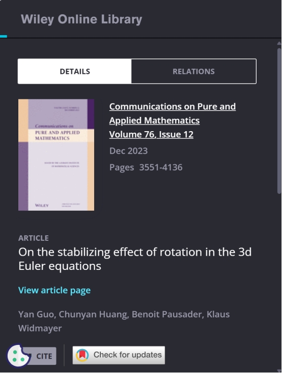 公司黄春妍教授与合作者美国布朗大学的Yan Guo教授,Benoit Pausader教授、瑞士苏黎世大学的Klaus Widmayer教授在国际顶级数学期刊Communications on Pure and Applied Mathematics(简称CPAM)上发表了题为《On the stabilizing effect of rotation in the 3d Euler equations》的研究论文。该论文研究了常速度旋转对三维不可压欧拉方程的长时间非线性动力学效应,证明了对充分小的轴对称初值,解几乎整体存在稳定。这说明旋转会改善方程解的稳定性,且不需要考虑旋转的速度。
