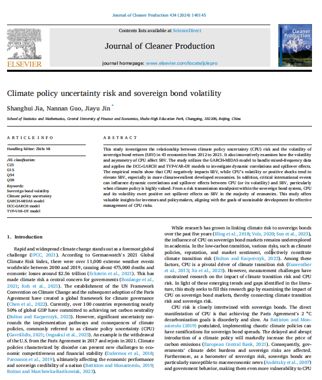 贾尚晖教授与金佳宇助理教授以及博士生郭楠楠关于气候政策不确定性风险对主权债券收益波动影响展开研究,相关成果发表在Journal of Cleaner Production(公司AA期刊,JCR分区Q1)。论文探讨了2012年至2021年间43个经济体中气候政策不确定性(Climate Policy Uncertainty, CPU)风险与主权债券收益波动(Sovereign Bond Volatility, SBV)之间的关系。研究还考察了气候政策不确定性的波动性和不对称性如何影响主权债券收益波动。研究利用GARCH-MIDAS模型处理混频数据,并应用DCC-GARCH和TVP-VAR-DY模型研究动态相关性和溢出效应。实证结果显示,气候政策不确定性对主权债券收益波动产生负面影响,而气候政策不确定性的波动性或正向冲击则倾向于提高主权债券收益波动,尤其是在气候适应性较强的发达经济体中。此外,关键的国际事件可以影响气候政策不确定性(或其波动性)与主权债券收益波动之间的动态相关性和溢出效应,特别是在高度重视气候政策的时期。从主权债券系统内部的风险传递角度来看,气候政策不确定性及其波动性在大多数经济体中对主权债券收益波动产生正向净溢出效应。本研究为投资者和政策制定者提供了宝贵的见解,帮助他们有效管理气候政策不确定性风险,推动可持续发展目标的实现。